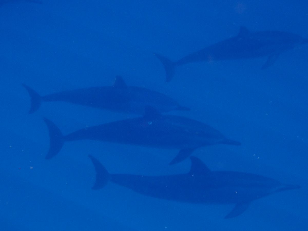 私はフィンやゴーグルの扱いが初だったため、少し泳いだだけでバテバテでしたが、近くにイルカがいる!と自分を奮い立たせなんとか進んでいると、前を泳いでいたスタッフさんが急停止。何かと思っていたら、「下見て!!」という声が聞こえたので急いで海の中をゴーグルで見ると、そこには7~8匹のイルカがほんの数メートル先をゆっくりと泳いでました。