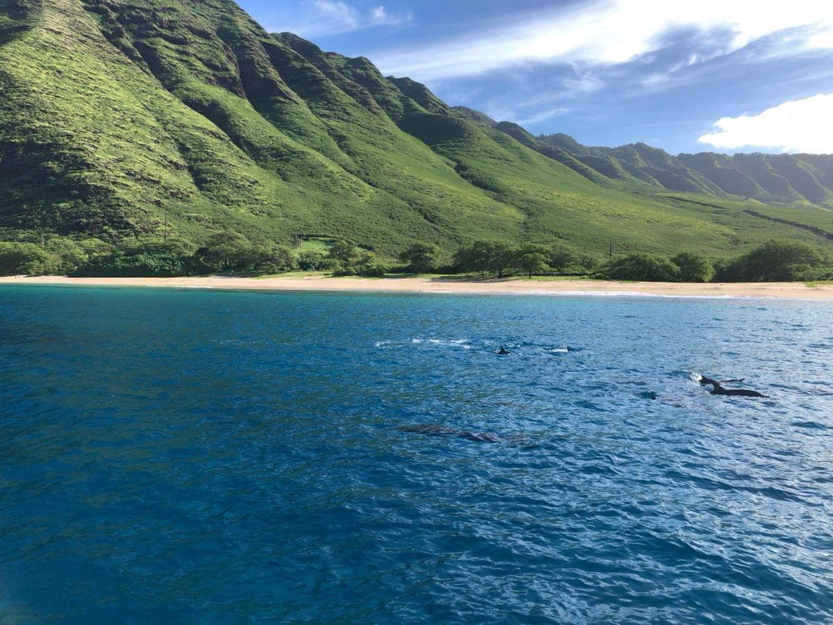 イルカと泳ぐのが長年の夢でした。朝早くの出発で少し眠さもありながらツアーに参加しましたが、道中にスタッフさんからハワイやイルカについてのお話を沢山聞けて、すごく楽しく1時間があっという間でした。乗船後もみんなで楽しく会話しながら、船長さんの赴くままに船は出航!!!!イルカに会えても、せいぜい2.3頭だろうと思っていましたが、いざイルカ達のポイントに着くと、30頭以上のイルカ達に出会えて、テンションが上がりまくりました。ウミガメや大人しいサメにも出会え、気分はアリエル状態♪シュノーケル後は、船上でポークおにぎりやおかしを食べ、フラダンスを踊りながらの帰航。初めから最後まで、全てがとても楽しい幸せな時間でした。次にハワイに来る時も、また参加したいと思います。