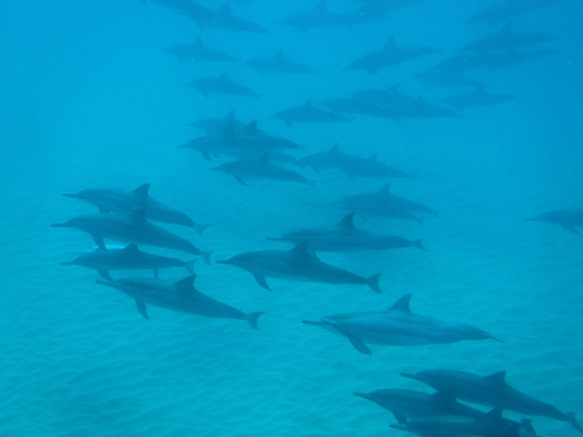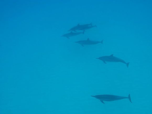 朝やや早(7:00)7:00日本人女性スタッフが迎えきました。現地まで1時間、ゆっくり眠ることができました。フレンドリーな現地スタッフ3人(1人は日本語堪能)と前記女性スタッフの4名で船出、客は30人くらい。出航して10分くらいでイルカの群れを発見。スタッフの指示で順次海に入りイルカを追いました。残念ながら客の数名がバシャバシャと音を立て泳いだためイルカが逃げてしまいました。何度か乗船、飛込を繰り返し、最後に50頭くらいの群れを発見、再度海に飛び込み海底を進むイルカ50頭の群れを見ることができました。シュノーケリングポイントではウミガメに遭遇し、潜行するウミガメをゆっくり見ることができました。