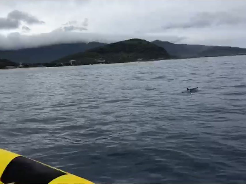ツアー参加前は、本当にイルカと泳げるのか半信半疑でしたが、本当にイルカと泳げました、というか私の下を30頭ほどのイルカが泳いでいきました。まさかこれほど近くでイルカと一緒に泳げるとは思っていませんでしたのでとても感動しました。また、クジラを船の上から見ることもでき、最後の港に帰る途中で、な・な・なんと!ウミガメにも遭遇することができ、最高の思い出となりました。最後に注意点ですが、2月のハワイは冬の時期ですので、海の中や海から上がった船上はとても寒かったです。(その日は曇りで時々雨も降っていました)また、普段船に乗ることが少ないので船酔いにも注意です。最低でも2時間ほど船に乗りますので、特に子供には酔い止めの薬が必要です。結構みんな吐いていました。またライフジャケットがあるとはいえ、海で泳ぐことも少ないと思いますので、最初からイルカを追って急いで泳がず、体力を残しながらゆっくりと泳ぐことをおすすめします。1回目で見れなくても、スタッフさんが気を使って場所を変えて再度チャレンジしてくれます。(私も2回目でイルカと泳ぐことができました)最低3回は海に入りますので、体力温存がカギとなります。結構、1回目で力尽き、あとは船の上でぐったりとしている方がいました。こうなると船酔いの危険性が高まります。とても楽しいツアーですので、事前の情報収集と体調管理が大切です。いい思い出となりました。