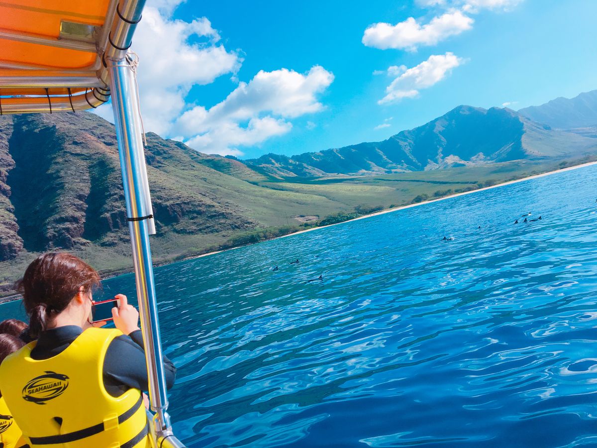 イルカと一緒に泳ぎたくて、イルカ大学に入学しました。バスに乗って、港までの間もスタッフが色んなお話をしてくれて楽しく過ごせました。船に乗ってイルカのいるところまで向かう間に、クジラも見えて感動しました!二度船から降り、イルカの大群をたくさん間近で見れて嬉しかったです。また海ガメも間近で見れたり、魚も見れて楽しかったです。SUPや滑り台やカヌーはおまけで少し出来るくらいで物足りなかったですが、すごく楽しかったです。またワイキキに来れたら、イルカ大学に入学します!!