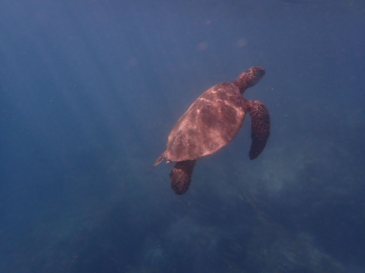 その後は場所を移動して、カメウォッチング。移動の時にもたくさんのイルカ達が泳ぐ中を船が進んで行きます。2度目のイン。そこは透明度はあまりなく魚が少しいるくらいでしたがたまたま真横にカメが浮上して来て一緒に泳げました。