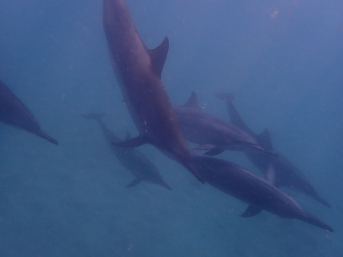 出航してすぐに、イルカの大群と遭遇することができました。とてもラッキー!思っていたよりも、ずっと近くにイルカがやってきて、大満足でした。ただ一グループの人数が多く、シュノーケルに不馴れな方も多いので、動きずらかったのが唯一残念なところです。バシャバシャ泡を立ててフィンを蹴る人も多く、困りました。