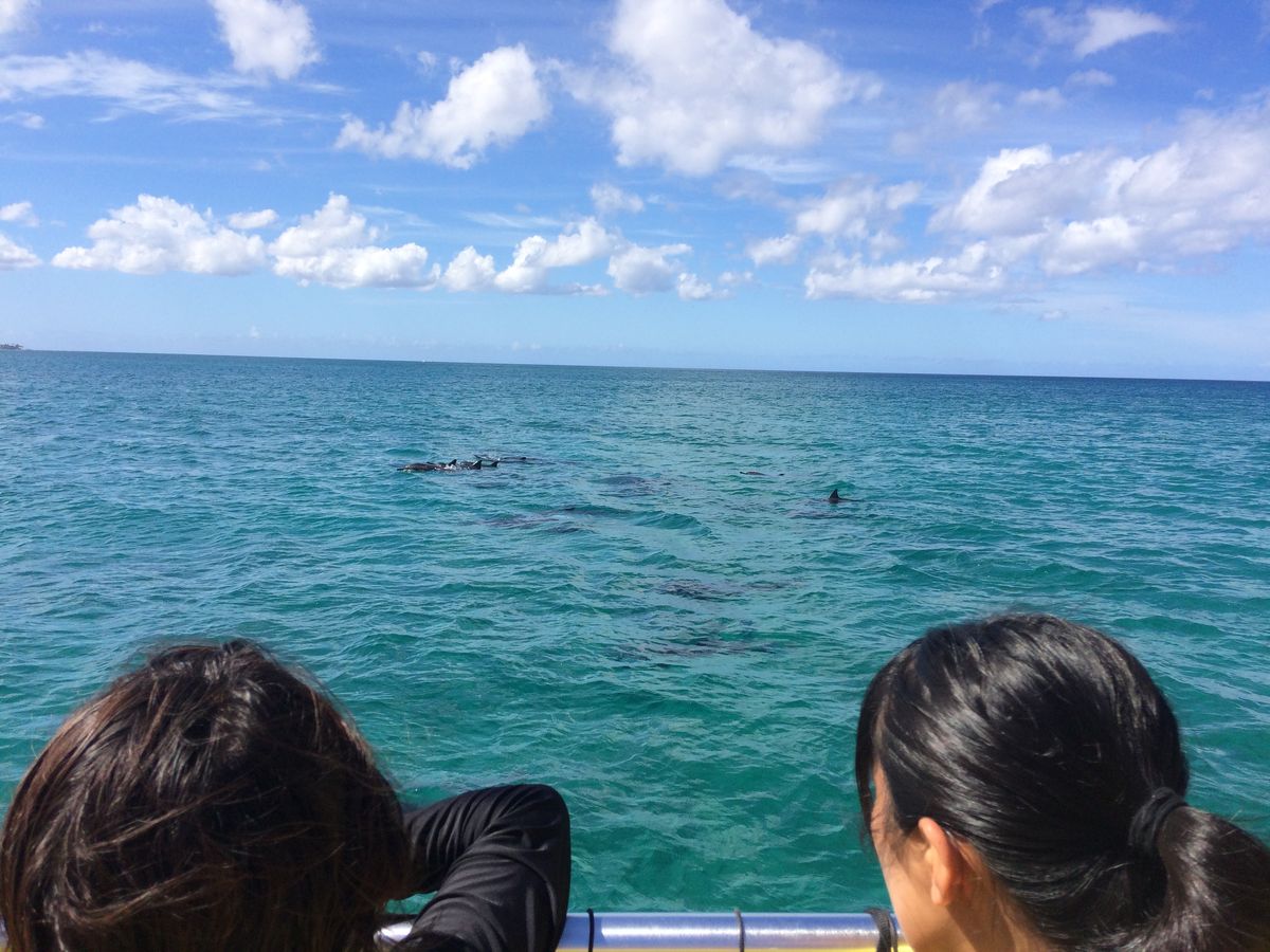 初めてのハワイ。今まで、シュノーケリングは2回ぐらいやったことがありましたが、海の中を泳いでいる野生のイルカを見るのは初めてでしたので、とても楽しみにして参加しました。