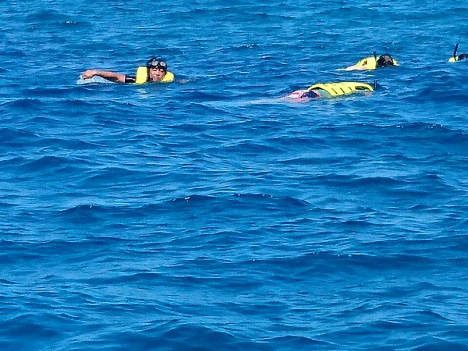 船上でシュノーケルの説明を受け、イルカが居る場所で船からダイブ!数頭のイルカが自分たちの下をスーーーっと通っていくのが見えます。初めて海の中で見るイルカに大興奮!2度ほどイルカを見た後、船上からイルカを見る機会もあります。