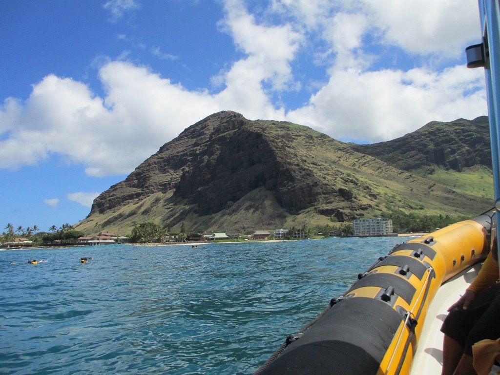 ホテルまでお迎えがあり、バスで1時間ほどかけて西オアフに到着です。着いたらすぐに準備をしてゴムボートに乗り込みます。水着の上にラッシュガードや短パン、荷物は最低限で水にぬれないようにしてくることをお勧めします。
