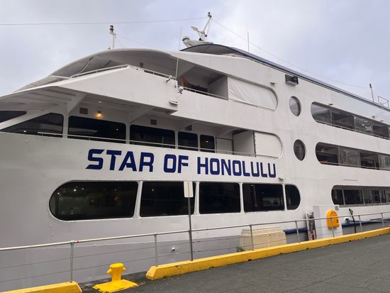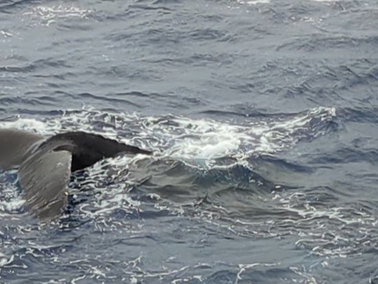 参加日は悪天候でしたが、普通に出航。大きな船なので揺れはなくそこは安心でした。しばらくは1階船室でコーヒーやパイナップルブレッドを食べて過ごしていましたが、英語でクジラ発見のアナウンスがあり、急いで上の階へ移動しました。初めは離れた海面にブ... 続きを読む