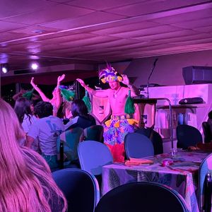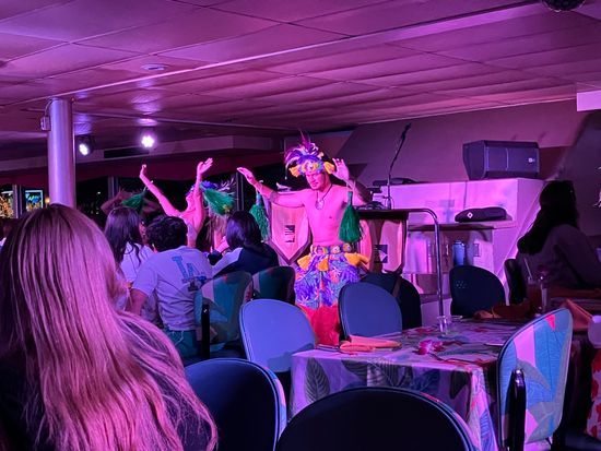 あいにくの曇りでサンセットは見れませんでしたが、船内の雰囲気・食事・ショーを楽しむことでき参加して良かったと思いました。