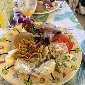 岸に戻った後、私たちはすぐにルアウに向かい、ディナーとエンターテイメントがすでに進行中の時間に到着したため、フラレッスンや文化的デモンストレーションなどのプレショーアクティビティのいくつかを見逃した可能性があります。ディナーはビュッフェと説明されていましたが、実際には一連のフードトラック、キオスク、またはブースのように設置されており、ゲストは異なるステーションを訪れて盛り付けられた料理を受け取る形式でした。この設定は多様な選択肢を提供しますが、同時に一人あたり複数の皿を使用することにもつながります。