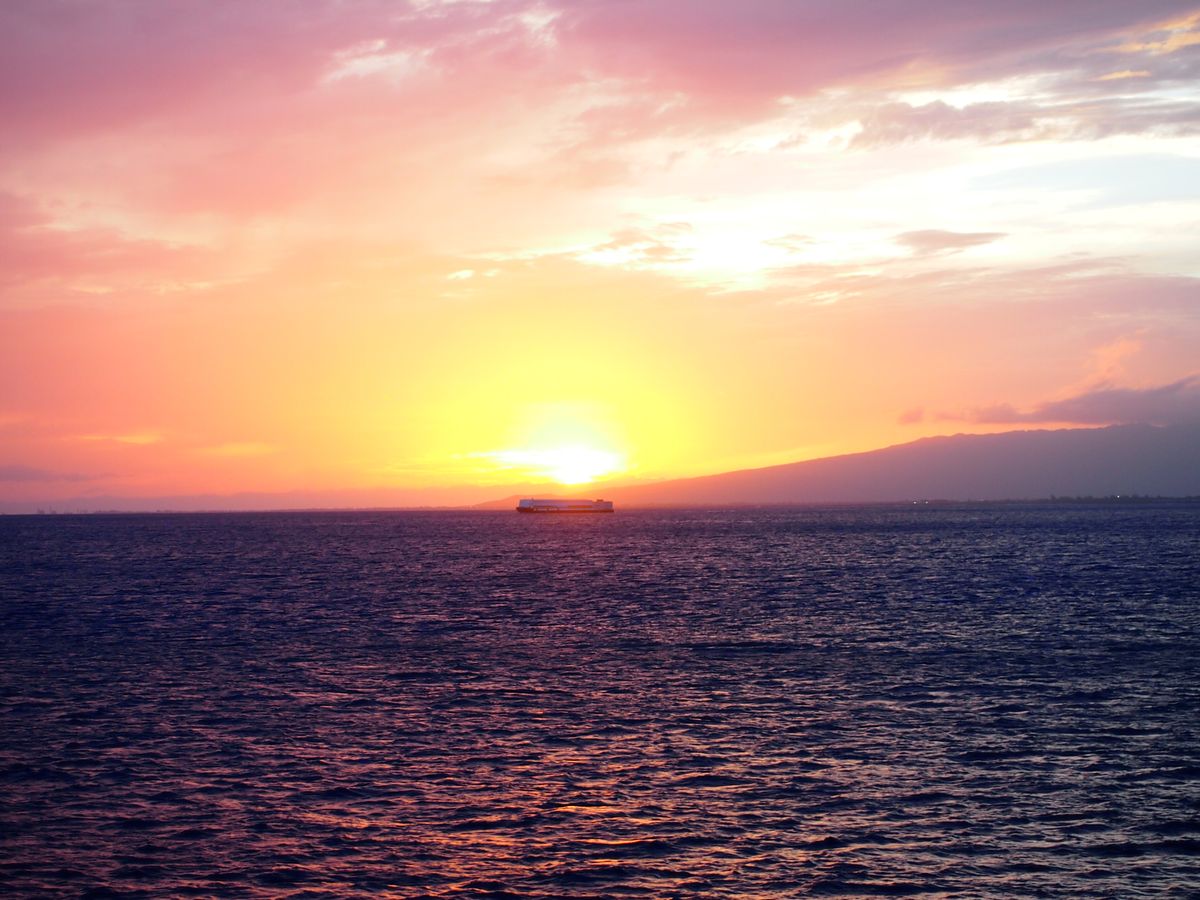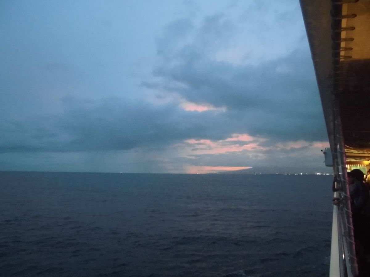 サンセットがとても綺麗でした。船の屋上まで出られるのかと思っていたのですが、この日は貸し切りだったようで上がれませんでしたので3階のデッキから見ました。