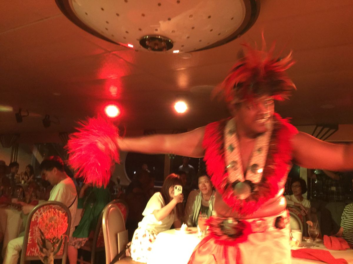 夕食付きクルージングは、2度目ですが、今回の船には、特段舞台もなく、数名のバンドと一人のハワイアンダンサーでさっぱりしたものでした。