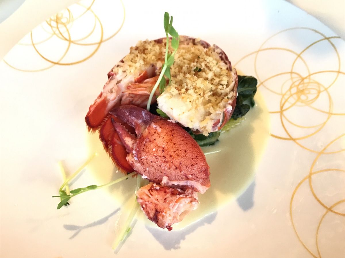ロブスター、お刺身かと思ったら、一尾まるごとボイルされたものが背に切れ目がひとつだけの状態でどーん。