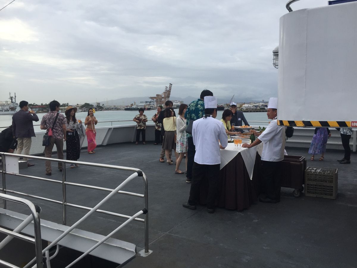 16名での挙式後のレセプションで利用しました。レストランですと追加の飲み物などが心配ですがこちらはフルコースの上に乾杯の他3枚ものドリンクチケットがあるので心配ありません。専属のカメラマンもお願いできます。2段ケーキも豪華な花で飾られた素晴らしいデコレーションでした。2人だけのファーストダンス、リクエストの曲の演奏、少し雨でしたが乗船後もスタッフが傘を指して見送ってくれました。すべてにおいて細心の注意とホスピタリティで接していただき、心より感謝しています。日本からハワイの挙式を予定されている皆さん、どうぞレセプションにこのコースをご検討ください。参列者もそれぞれに楽しみ、想い出に残ります。素晴らしい一日でした。本当にありがとうございました。