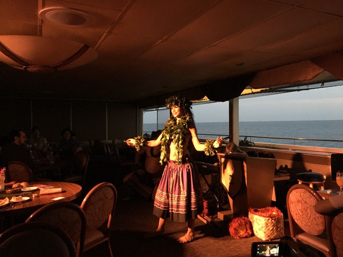 ハワイで是非やりたいことだった念願のサンセットクルーズでしたが、残念ながら曇っていて美しい夕日はお預けでした。でもカニとステーキは美味しく、ハワイアンショーもムードを盛り上げて楽しい演出でした。2月は雨季で天気も不安定なので、クーラーで寒くないように上着があれば安心です。また念のため酔い止め薬を飲んで乗船しました。
