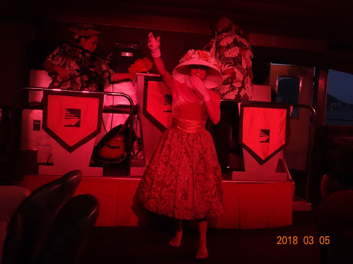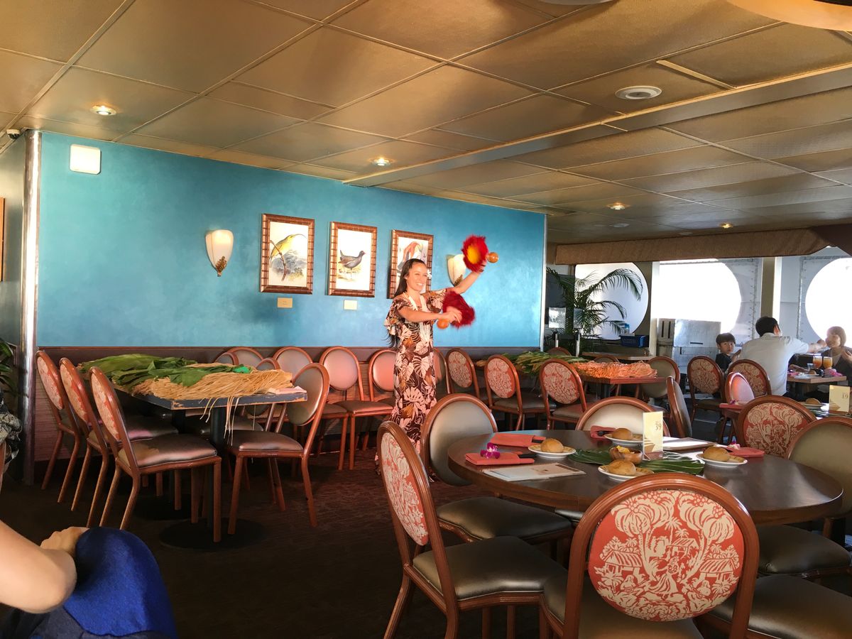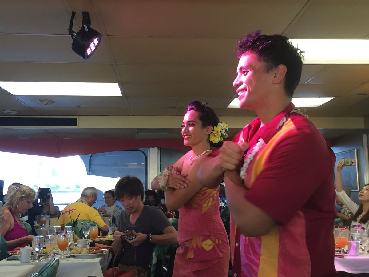 船内ではビュッフェと共にハワイアンダンスのエンターテイメントが繰り広げられ,さすがハワイアン❗️とても盛り上げるのが上手でついつい私も子供と一緒に輪の中に入り踊ってしまいました。