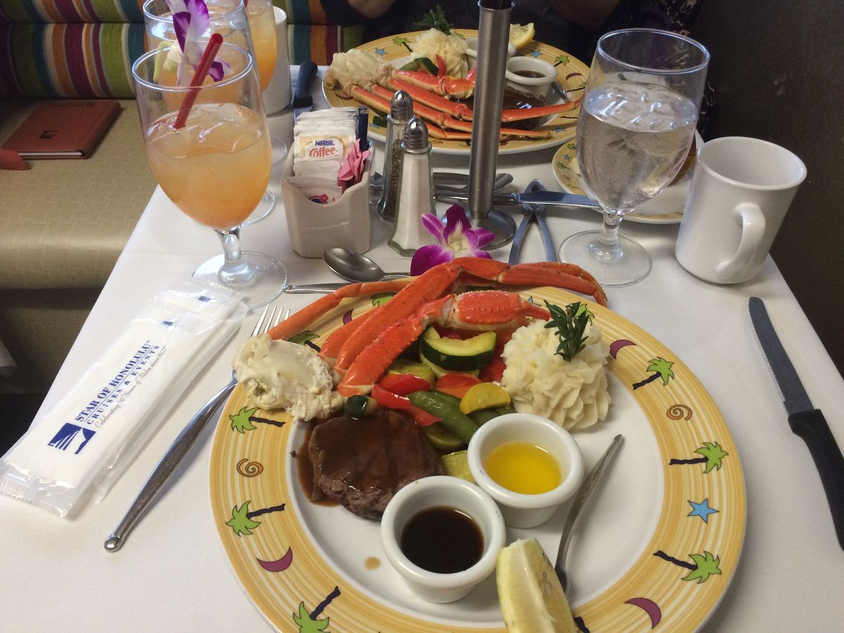 サンセットの時のディナーとショーでした。デイナーのカニは、今回食べたなかでは、一番おいしかったです。ステーキもまあまあではないでしょうか。
