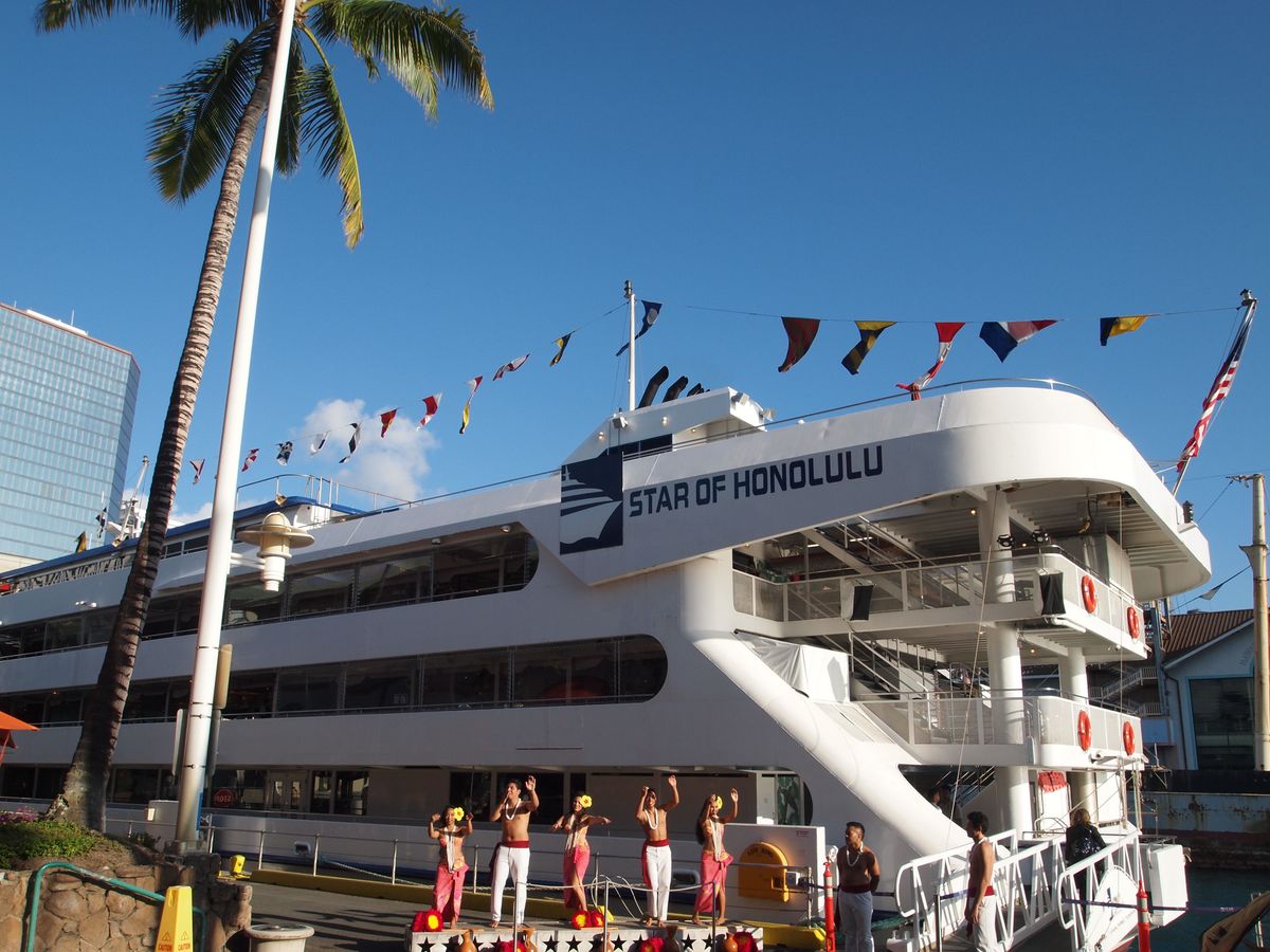 乗船受付の場所が分かりにくく少しウロウロしたが無事チェックイン。乗船時間になり席に案内されると次々と運ばれる料理はやや慌ただしい気がしたが味も量も満足。クルーズしながら食事と思っていたので残念だったが波で揺れると食べにくいからとのことで納得。食事がほぼ終わり、日没に合わせて出港しホールでは太平洋の島々のダンスパフォーマンス。デッキではホノルルの夜景、太平洋に沈む夕日を堪能し色々な面で満足できるアクティビティでした。
