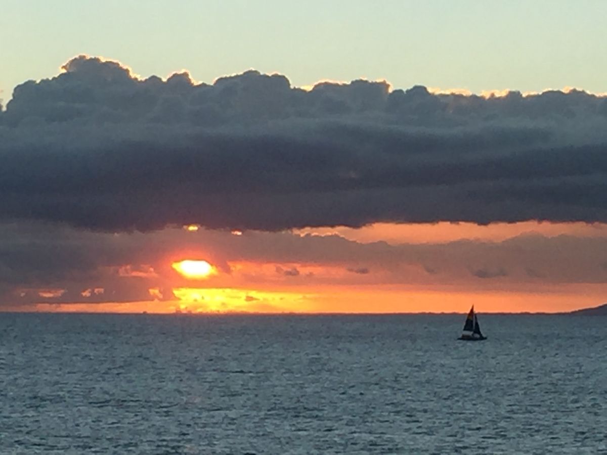 まさに順風満帆でワイキキ沖をカタマランで風に乗って進みました。肥大半身TATOOの女性クルーが作ってくれたマイタイを飲みながらサンセットを待ちました。太陽が水平線に沈んみきった時には、一斉に拍手が沸き上がりました。
