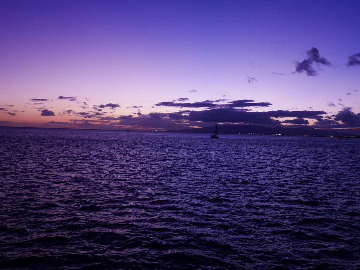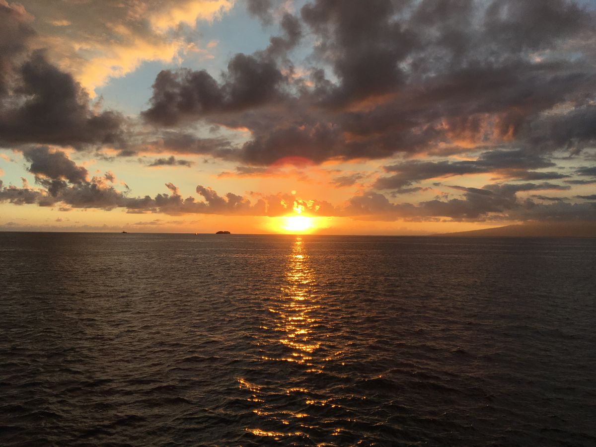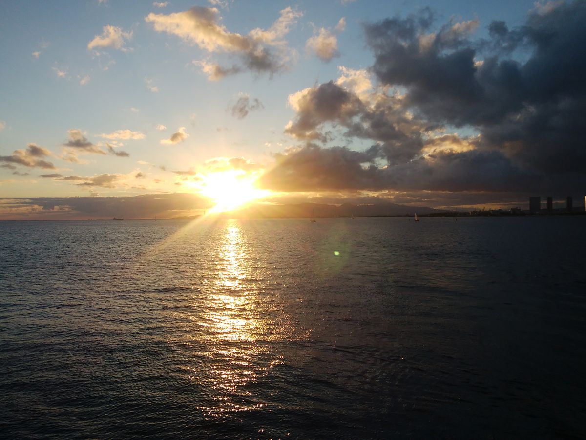 出航時には、西の空に黒い雲がかかってサンセットは諦め気分でしたが、なんと、日没には雲の間から夕日が出てきて最高でした。
