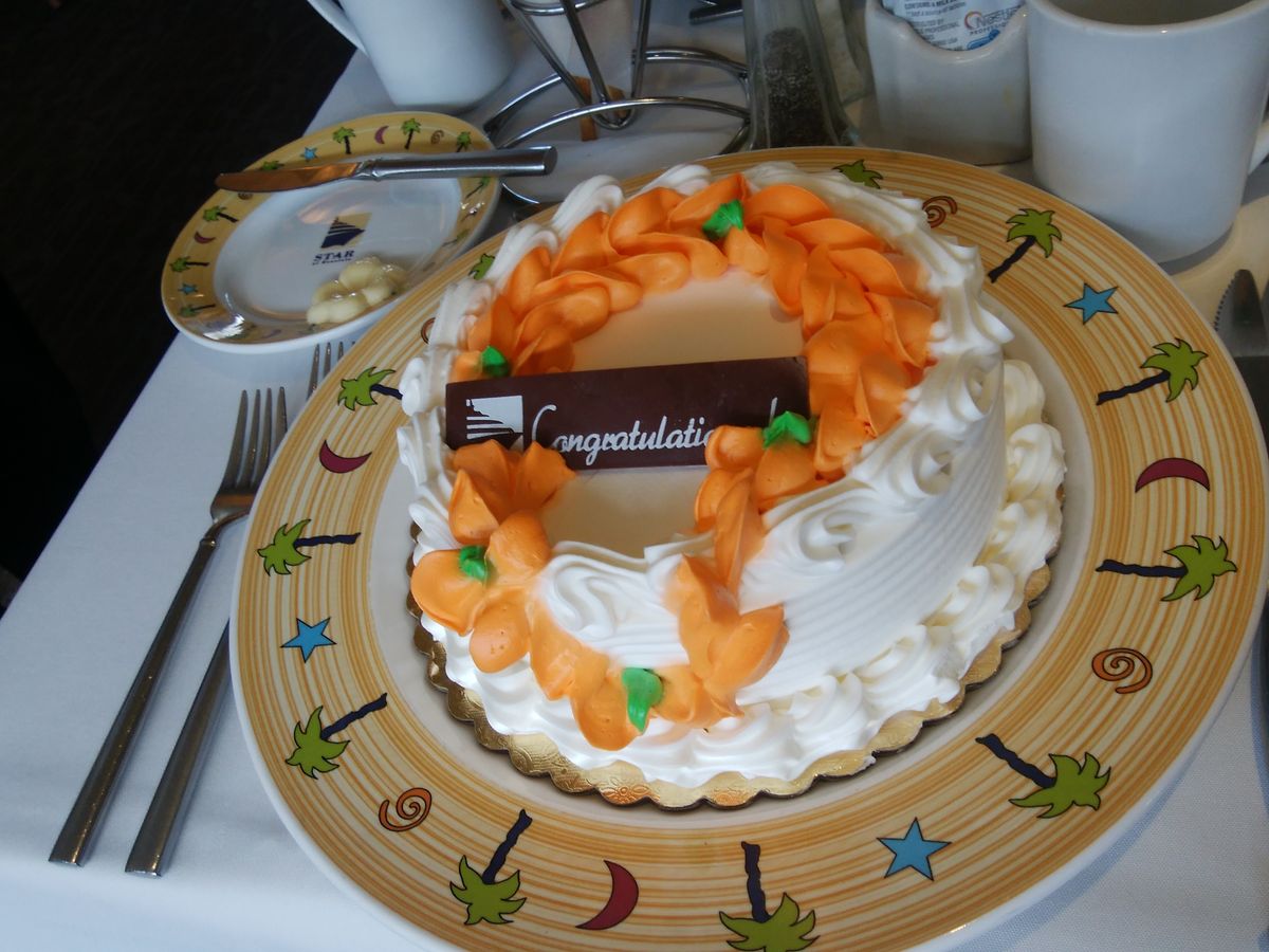 ハワイで挙式を上げる息子夫婦を招待してクルーズに参加したので、通常のロブスターとステーキに加えて、お祝いのケーキも追加となったが、満腹で食べ切れるまでには至らなかった。くくテーブルに付いたシャンパンボトルを飲みすぎたのも一因かも。上甲板から金曜夜の花火を堪能した後、帰港までにクルーが参加者を誘うダンスは盛り上がった。