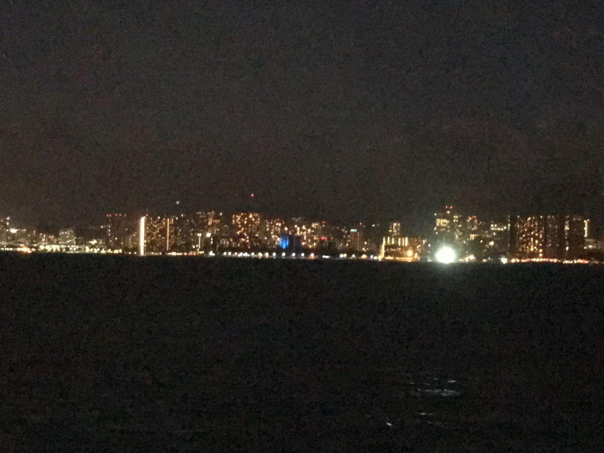 船が動き出すと間もなく乗員が窓の水滴を掃除してくれ、ワイキキの浜辺の素晴らしい夜景が浮かんできました。夕焼け空は見れませんでしたが、納得の風景でした。