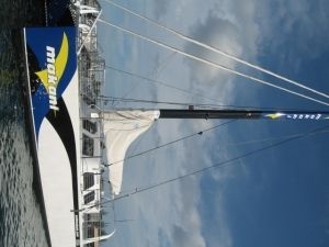波の上をすべるように進むカタマランクルージングは爽快そのもの!