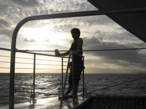 サンセットセーリングに参加しました。これまで比較的大き目の船のディナークルーズの経験はありましたが、全く別物ですね。これは。沖に出るまでは、エンジンを使っていたようですが、沖に出るとハワイ特有の強い貿易風(トレードウィンド)にのってのヨットセーリング。風と波をきる感触は爽快の一言。頭にシーブリーズ!て単語が自然に浮かびました。このカタマラン型ヨットは今年、浸水したばかりでほんとピカピカでした。食事はビュッフェスタイルの料理で品数は少ないですが一つ一つがほんとおいしかったです。期待していなかったので余計おいしく感じたのかも知れませんが。何と行ってもデッキを盛り上げてくれたのはかっこいいクルーのお兄さんたち。キャプテンはなんと!日本語しゃっべていました。私たち以外はアメリカ人の方ばかりで、最初少し緊張したのですが、キャプテンがいきなり日本語で話しかけてきたので、いっぺんに緊張吹き飛びました。ハワイのマリンブルーの海でのセーリング、ワイキキ、ダイヤモンドヘッドも一望できました。カタマランの水平線と同じ高さから見るサンセット、陽気なクルーのお兄さん、デッキの上に寝転がって頭真っ白にして見た真っ青な空、全部最高!!!