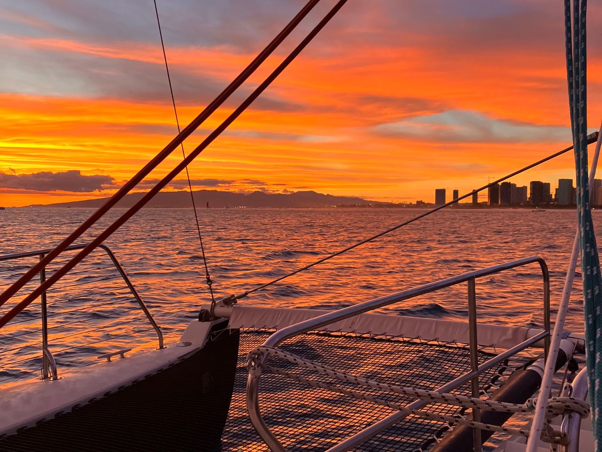 ハワイ旅行最後の日に、サンセットクルーズ参加しました。揺れも少なく、比較的穏やかなクルーズでした。その後、ディナーを予定してましたので、普通のロングワンピースで参加しましたが、少し水しぶきがかかるくらいで、たくさん濡れることもありませんでした。ただ、船に乗り込む時は、足が濡れるので、パンツとかは避けたほうがいいです。乗船後は英語での説明で、何言ってるかさっぱりでしたが笑。特に困ることはないです。夕日が沈むとこもキレイですが、その後が幻想的で素晴らしく、参加して良かったです。以前に昼間のクルーズも乗りましたが、絶対サンセットクルーズがお勧めです。