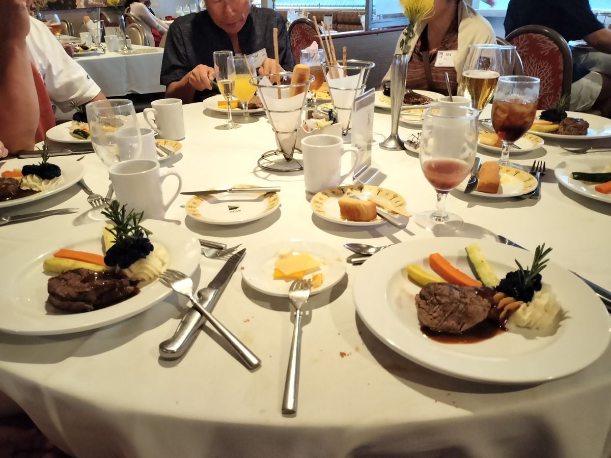 ビュッフェのコースにしました。正直、食事はまあまあ。焼きそばなどもあり、メインのローストビーフは、少しペラっとした感じ。サラダや他の料理も一枚の大皿にどんどん盛るしかない。かなりの客がいるので、席の順番で促され並んで料理を取って行きます。