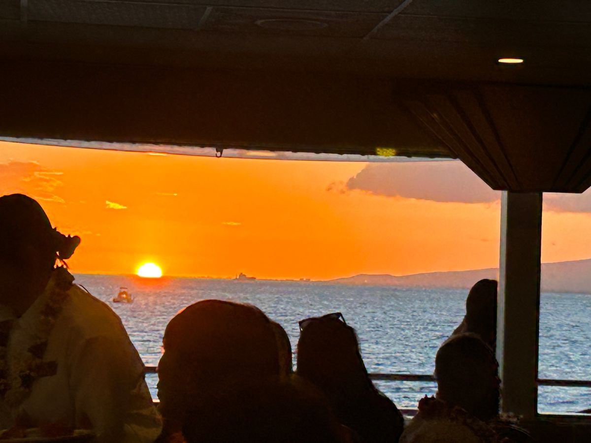 母のハワイっぽいショーがみたい、クルーズ船にのりたい、コースディナーが食べたいという要望にサンセットまでついていたので参加させていただきました。船が出てからしばらくは太陽に照らされ、暑かったのですが、日が沈んでいくにつれ、風も気持ちよくディナーも美味しかったです。