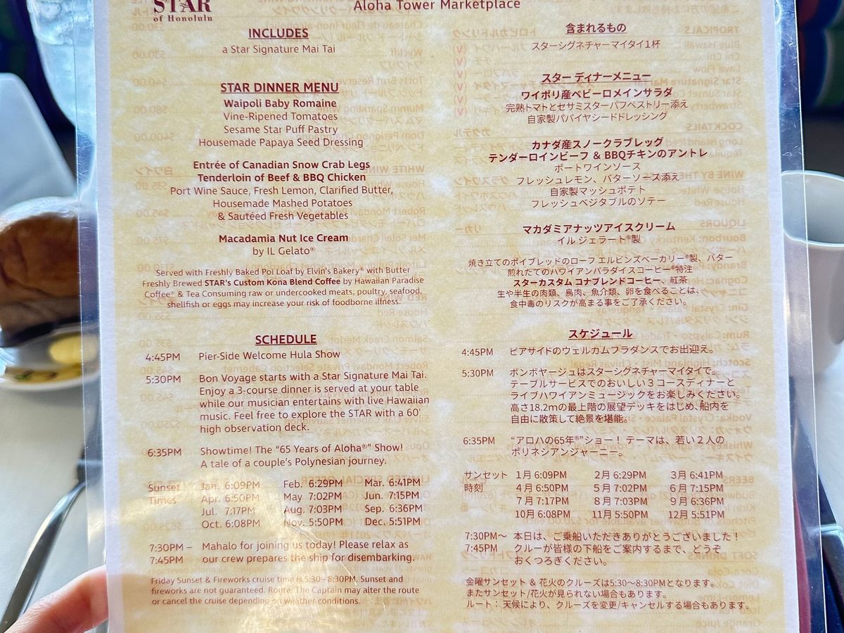 この度は私共のスターオブホノルル号デイナークルーズにお越し頂き誠に有難うございました。天候も良くてお食事も楽しんでいただき、ハワイでの素敵な思い出作りのお手伝いができたことをスタッフ一同光栄に思っております。またのお越しをスタッフ一同お待ち申し上げております。