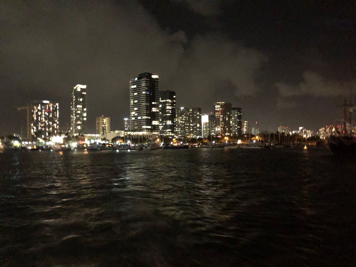 まずは花火が良く見える場所まで移動しドリンク(ほとんどの方がマイタイでした)を頂きながら花火を鑑賞。風も穏やかで気持ちの良い時間を過ごせました。花火が終わると、ダイヤモンドヘッド沖までセーリングし、ぐるっと回ってシェラトン前まで戻ります。