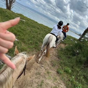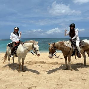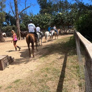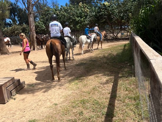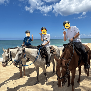 トイレ休憩やお土産物を見るのも良いでしょう。私は、写真を撮りTシャツを購入しました。その後、牧場まで連れて行ってもらい、乗馬体験のスタートです。ドライバーさんは日本語ぺらぺらなので、行きの道中におおよその説明をしてくれます。というか牧場のスタッフの方々は全て現地の方なので、日本語は通じませんw でもフレンドリーに接してくださるので見よう見まねで全然大丈夫でした。子供も日本で馬には乗ったことがあったのですが、引き馬でなく自分で動かすのは初めて。しかも1時間近く乗りますので、最初は不安でしたが、馬さん達も非常に大人しく、すぐに慣れて安心して見ていられました。それよりも自分のお尻が痛かったですw 天候も良くて、馬に乗りながらビーチ沿いを歩いていると時の流れをゆっくりに感じて、貴重な体験をしているなぁとしみじみ感じてしまいました。日本ではこうはいかないと・・・ また機会あれば体験したいですが、普段使わない足の筋肉が酷使されているため、馬から降りた直後は心地よい筋肉痛を感じることをご了承ください。