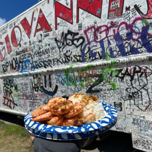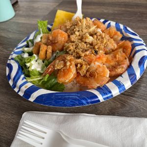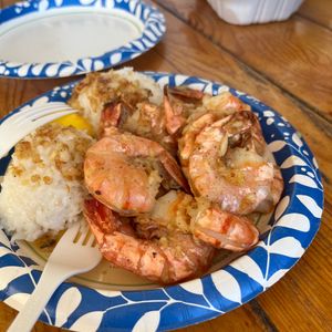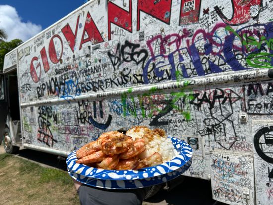 東周りのツアーでカフクファームのハワイ産アサイボール、ロミーズは大きなエビのガーリックシュリンプ。