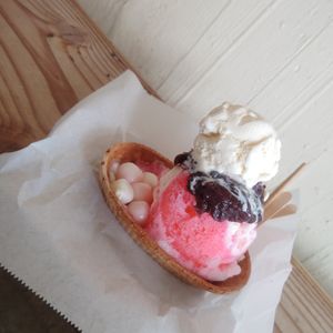 迷路で汗をかいた後、パイナップルのアイスを食べました。疲れた体に染み渡る冷たさと甘さでした!
