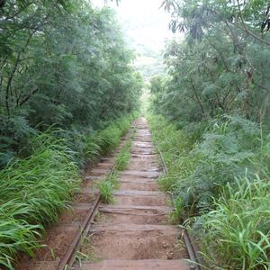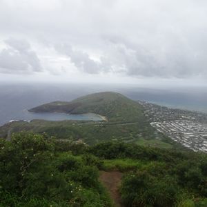 当日は、前日からの雨模様で、ホテルからHOPまではシャワーのような雨降りで、スタッフからも今日は見合わせてはと勧められましたが、ポンチョと連絡用携帯電話をお借りして、チャレンジしました。登り始めて、数分で雨も上がり、ポンチョも脱いで、登頂??開始。最初の内は順調に登っていましたが、中腹辺りにある枕木の下が見えるスケルトン場所を過ぎて、段々きつく成って、30段程登っては、一休みする作戦に切り替え、何とか登りました。途中、20歳前後の現地の学生グループ数人も同じく休み休みして登っているのを見て若い子でもやっぱり大変なんだと感じました。ただ、頂上部では、ハナウマ湾・サンディビーチ・ハワイカイと眺めは最高で疲れやきつかったのも全て吹き飛ばしてくれるような爽快感と達成感で一杯になりました。チャレンジして良かったです。その後のカイルアタウンの自由時間も十分に楽しめましたよ。