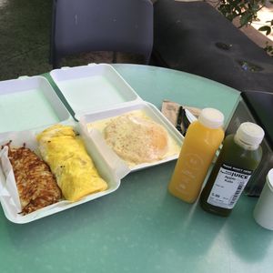 テイクアウトなので、食べる場所は??と心配でしたが、ホールフーズ内で買えるオススメオーガニックジュースを教えてもらい、私たちがお会計をしている間にヤスさんが椅子とテーブルを確保して、コップとお箸まで用意してくれていました!