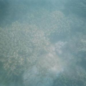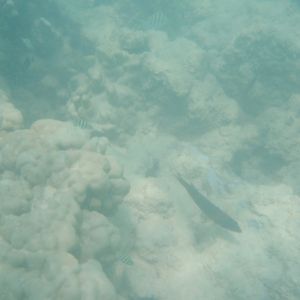 ?少し、魚がいる→サンゴ礁(中間あたりが少し黒くなっています。)を目指して、行くといます。シュノーケリングをしている人を探して、泳いでおられるところをめがけていくと、いいと思います。