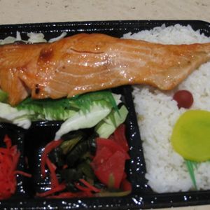お弁当は、見た目、しゃけ弁当ですが、大きい脂ののったサーモン、久々に食べたお米やたくわん、おいしかったです。