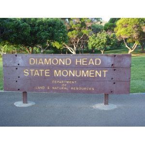 ダイヤモンドヘッドが大きいすり鉢上になっている事に、初めて気がつきました。下りはあっという間に降りてしまいます。登山口のところで、親切なおじさんが、モニュメントをバックに写真を取ってくれました。
