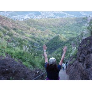 当日の朝、連絡の行き違いでお迎えが来ない・・・というハプニングはありましたが、どぉにか連絡も着き登る事に。すでに太陽は昇っていたんですが、のんびり登っていると、風が気持ちいいし、すれ違う人と笑顔で挨拶するのが非常に気持ちよかったです。頂上では一体どれくらいの景色が楽しめるのかな?!と楽しみにしていたんですが、おぉ~なるほどぉ~ワイキキが一望☆海もキレイに見れて、非常に満足☆☆途中、ちょっとだけ冒険しているような気持ちになる所とかあって、すごく楽しく登れました。