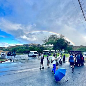 今年の元旦に参加しました。道中はガイドさんがハワイの豆知識をたくさん教えてくださり、とても勉強になりました!!早朝なので子供たちは寝ていましたが。。マカプウの初日の出は近年とても人気があるそうで、入口までの送迎でしたが個人のレンタカーでは相当早く来ないと停めるのは難しいと思います。小さいライトを貸してくださったので、真っ暗な簡易トイレ(割とキレイ)でもハイキングコースでも助かりました。我が家は旅の疲れもあり、途中のポイントで日の出を見ましたが、頂上まで行くと和太鼓や祝詞を捧げる儀式をやっていたそうです。見たかった!!!! 日の出とともに小雨が降りましたが、おかげで日の出と虹を見ることが出来ました!