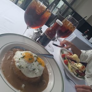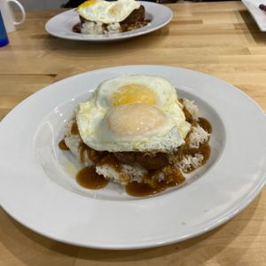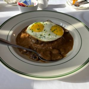 お店の入り口までアテンドしてもらい朝食となりました。ロコモコとエッグベネディクトをひとつずつオーダーしシェアしました。