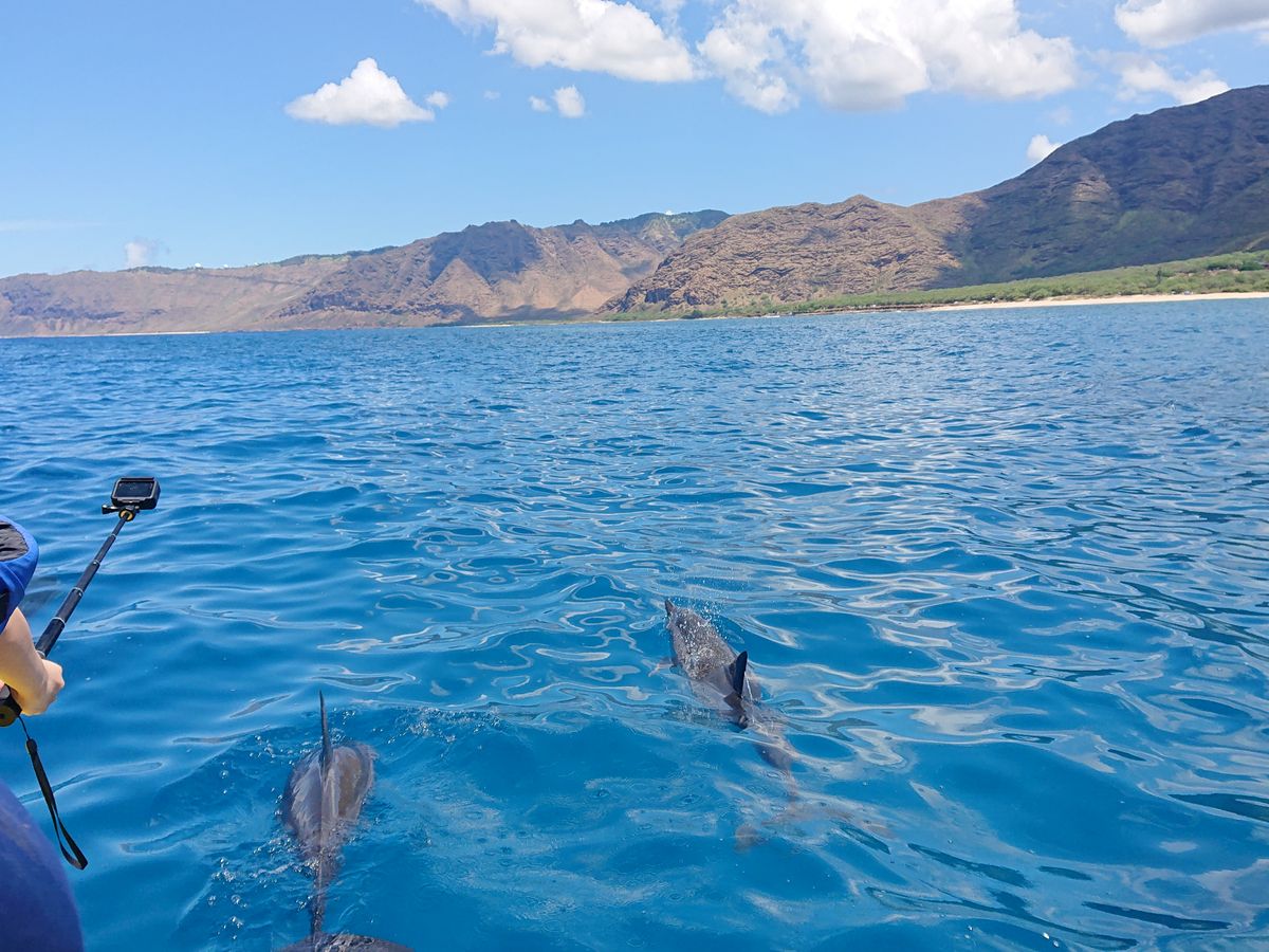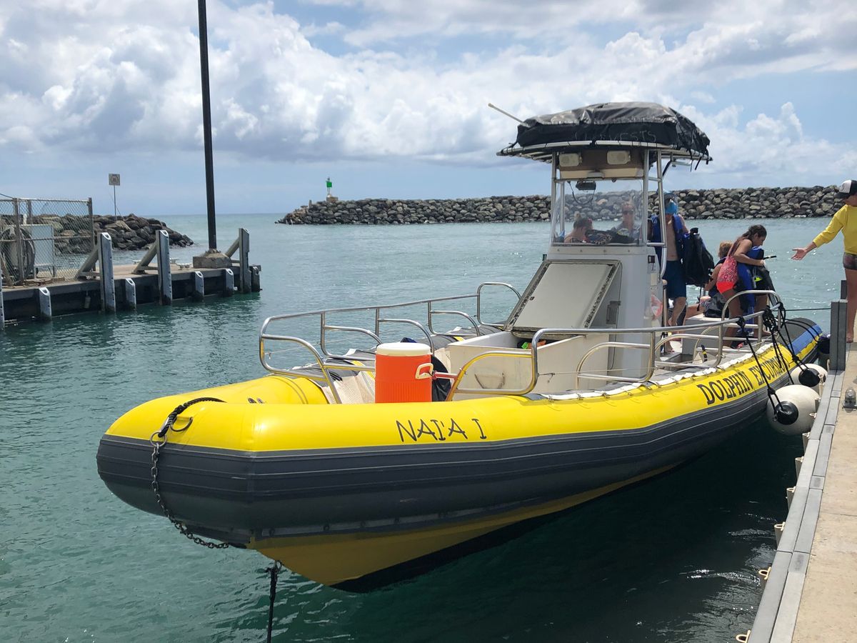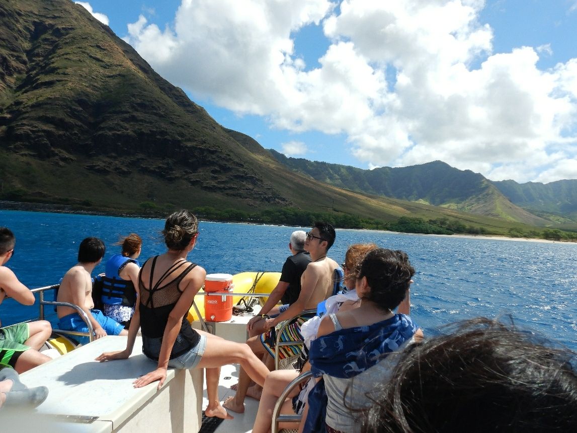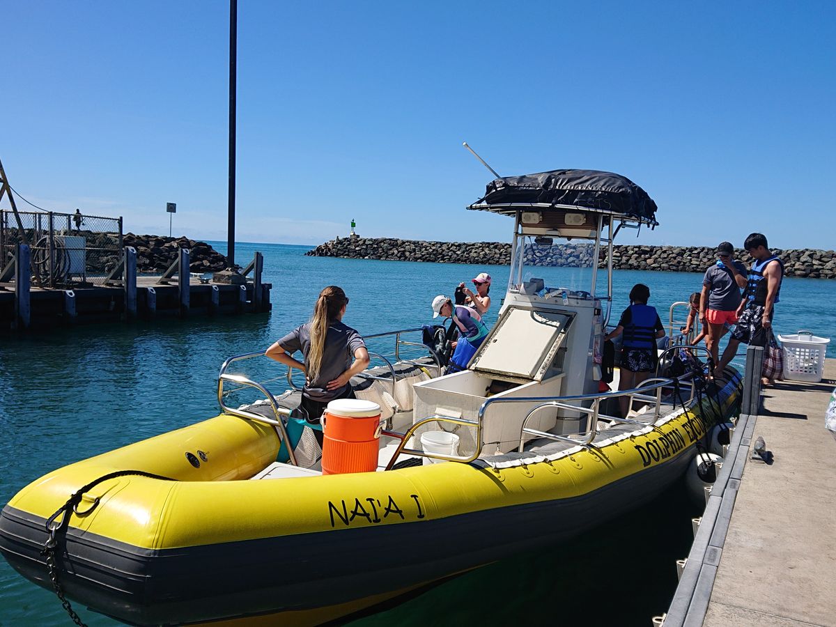 ドルフィンツアーは最高でした!最初に魚スポット、次にドルフィンスポット、そしてまた魚スポットと三ヶ所の海に連れて行ってくれました。魚のスポットではカラフルな魚たちに海亀がいて、アラモアナやワイキキビーチよりも透明度が高く美しかったです。ドルフィンは野生なので追いかけてると駄目なようで、人間はグループで固まって、雲の影のように佇んでいるとイルカが寄ってきてくれ、自分の直ぐ下を泳いで行く姿や、海面でツイストする姿に感動でした。約三時間程で、小型ボートに12人程の参加でした。スタッフ一人一人皆んな笑顔で親切で、よくサポートしてくれるので、私の英語力は日常会話程度で所々分からない時もありましたが、安心感がありました。また足の悪いおばあちゃんも参加されていましたが、皆んなのサポートで海に入る姿に感動しました。私は泳げないのですが、ライフジャケットがあるので特に怖くはありませんでした。慣れている人は自前のシュノーケルセットを持ってきていて、素潜りを楽しんでおられました。