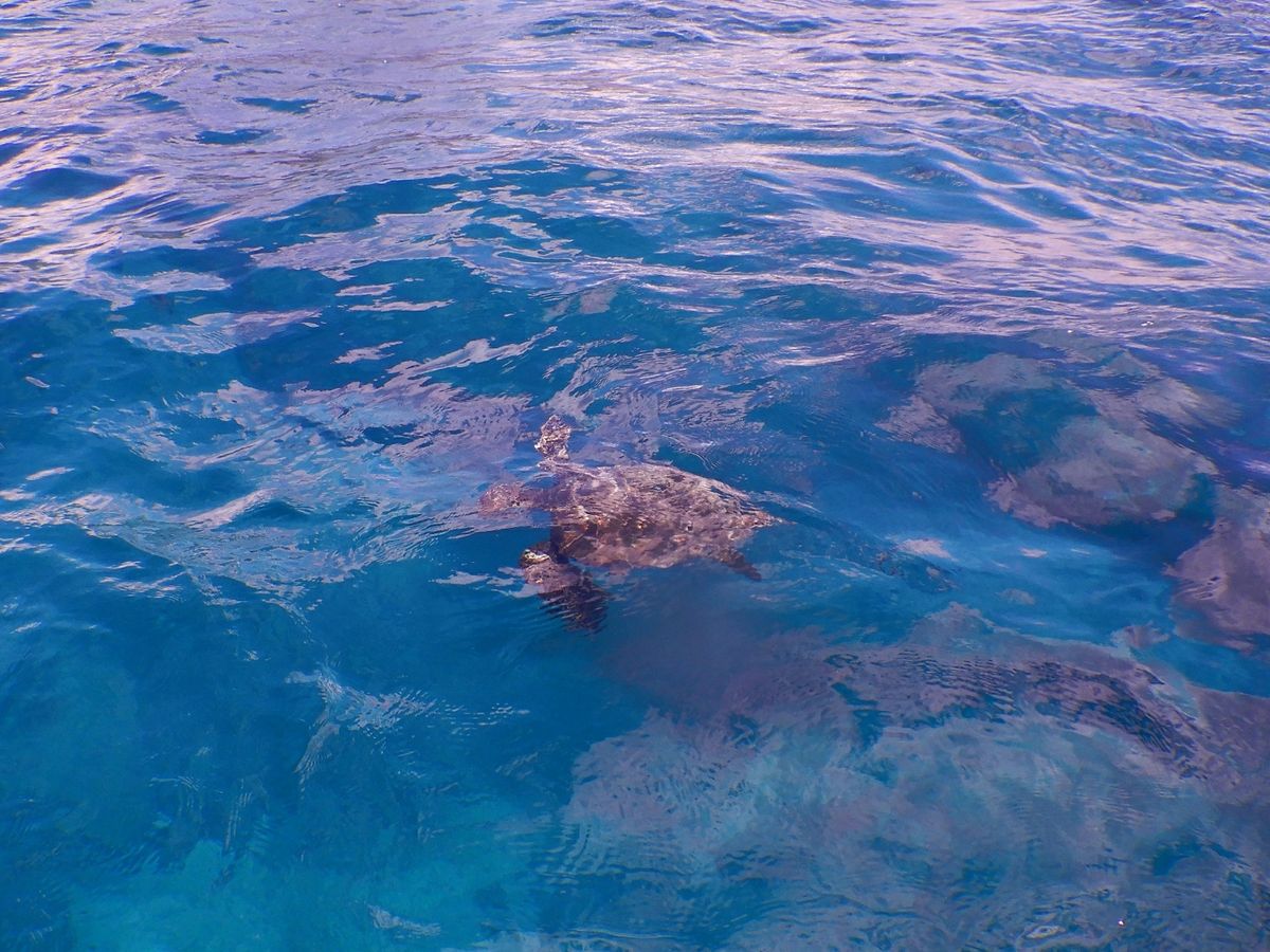 まずはシュノーケリングでウミガメやカラフルな魚を見ました。ウミガメが水面まで上がってきた時は本当に近くで見れます。