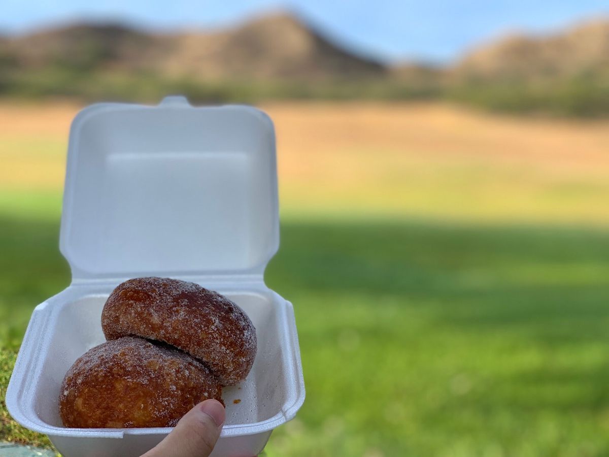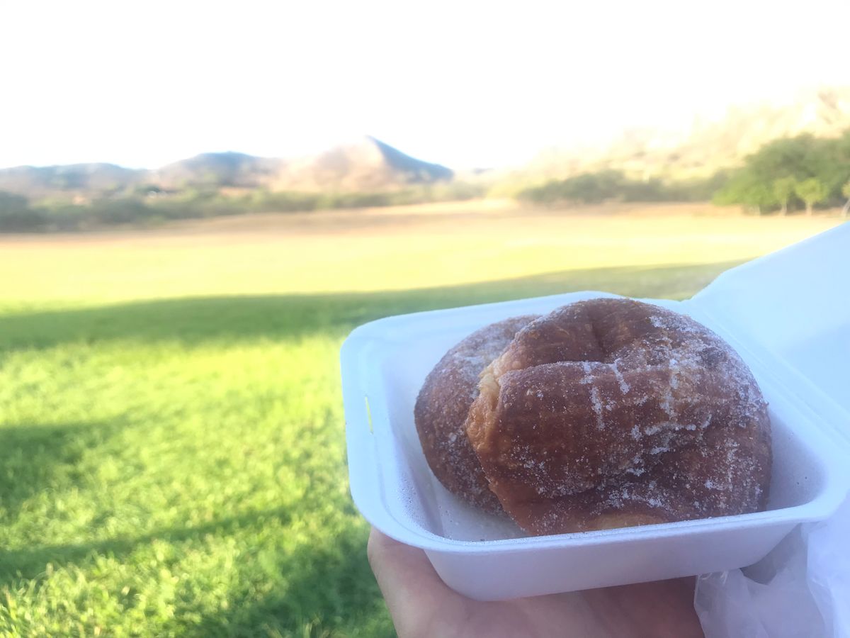 下山してから写真を撮ってくれてマラサダを食べました。この時点でまだ7時半です。