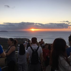 高齢の両親と一緒のツアーだったので、当日の天気は心配で、雨だったらキャンセルしようと思っていました。幸い、当日は天候にも恵まれダイヤモンドヘッド開門前の待ち時間も夜景や夜空がきれいで流れ星も見られました。頂上までは、でこぼこ道もあり真っ暗で懐中電灯は必需品でした。途中から、空が白み始め頂上付近は多くの人で身動き出来ない程でした。少し下山して、休憩できるスポットで日の出の瞬間を見ました。本当に感動的な時間を過ごす事ができました。ただ、下山に時間がかかり集合時間に5分程遅れ同乗者に迷惑をかけてしまいました。もう少し、時間に余裕があればよかったです。