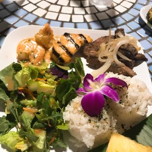 19:00にホテルまで迎えにきてくれました。ディナーでベアフットビーチカフェのB級グルメ満足プレート。花火は食後に見ました。花火は約5分間でした。レナーズのマラサダはあらかじめガイドさんが注文を聞いてくれてお店で購入してくれました。その際お店の中を自由にみたり写真など撮ってもいいということでした。タンタラスの丘は道沿いの駐車スペースに駐車し、下車しガイドさんが写真を撮ってくれました。