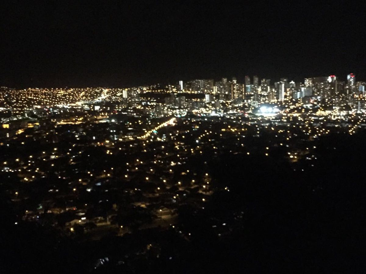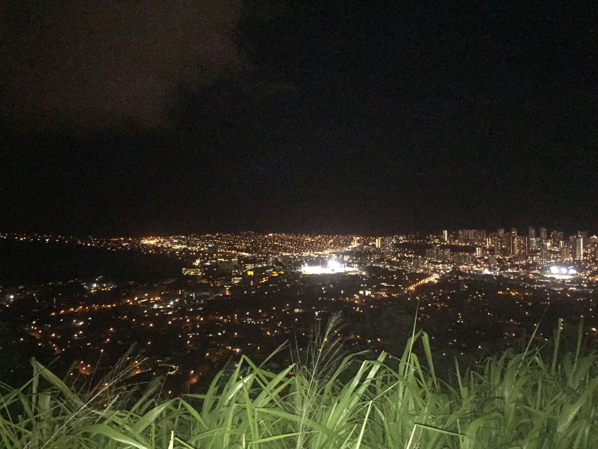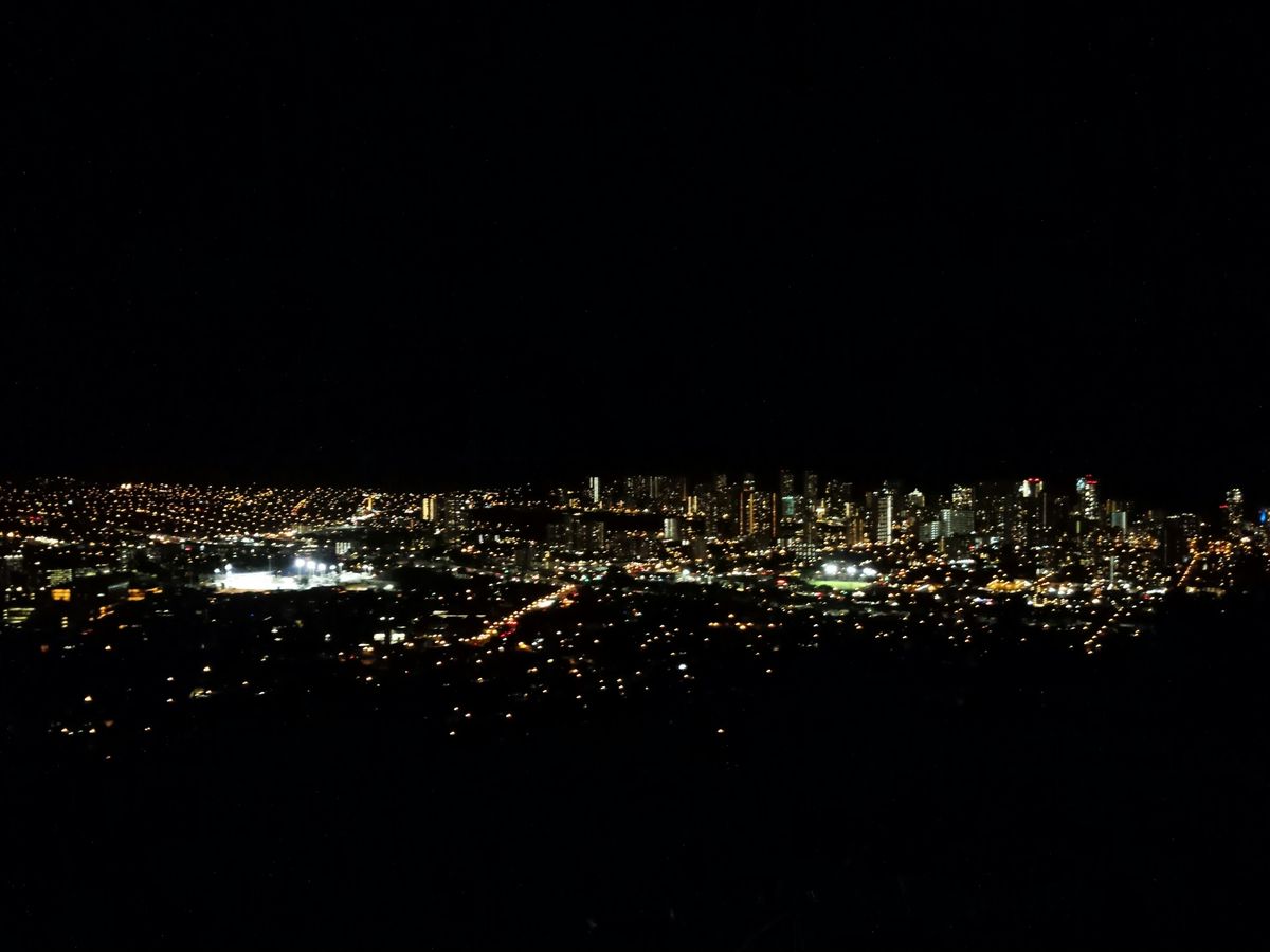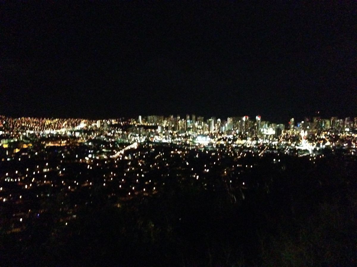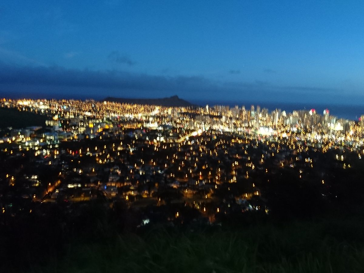当日は、すこし雨模様の日でしたが、丘に登った時には雨も上がり、眼下に素晴らしいホノルルの夜景を見ることができました。