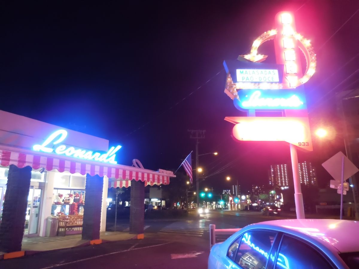 味わうことができました。テーブル席の照明をもう少し明るくしてもらえると、料理もよく見えて、かつ家族との会話ももっとはずんだのでは、ないでしょうか。その後、マラサダ(ドーナッツ?)の有名店「レナーズ」に寄り、いよいよ今回最後のビッグイベントとなるタンタラスの丘の夜景観光へ! 車から降りるなり、全員で「ワーオ、最高」と絶叫! 眼下に広がる金色?に輝くワイキキの街にしばしぼう然。さっそくジョイさんに記念写真を撮ってもらう。広告塔がないのにもびっくり。ところが突然雨が降り出したので、やむなく車の中へ。余韻を楽しみながらホテルへ! ジョイさんに感謝の握手をしてホテルの部屋へ。立ち寄りショップでいただいた「レナーズ」のマラサダを、タンタラスの夜景談義をしながら、おいしくいただきました。ジョイさん、VELTRAさん、最高の夜を有難うございました。